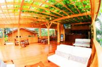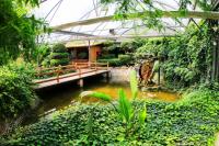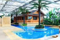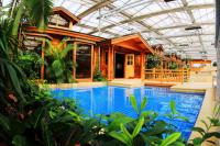 热带风情馆的整体风格以木结构建筑为主,清澈见底的泳池水环绕其间,还有椰子、枇杷、槟榔、芒果等热带植物相互掩映,打造了一处独具特色的养生中心。
