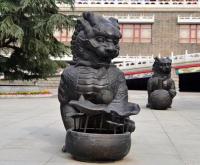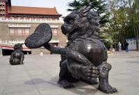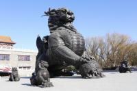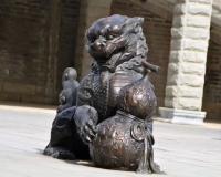 东侧大麒麟背上有一个小麒麟,为雄性,胸部肌肉和线条均比较雄厚,头上的角及面部均与雌性有所不同。 东侧小麒麟分别为麒麟御书、麒麟如意、麟送宝珠、麟送聚宝。