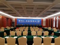 贵州厅: 位于会议中心西侧,面积1100平方米,层高8米;有吊装隔板,可分为三块均等大小的场地;场内满敷高级地毯。座位可任意摆放,最大容量:课桌式500人,剧院式700人;有音响、投影、录音录像设备;主席台位于场内北侧,长14.6米,宽3.6米,高0.5米,主席台后设有背景架,高5米,宽12米。