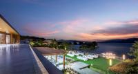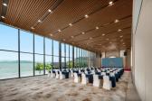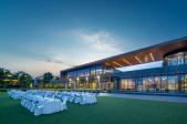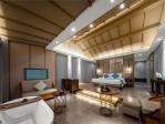 酒店临水而建,错落有致,以现代中式韵味为整体建筑格调,白墙黛瓦与周边生态环境自然融合。